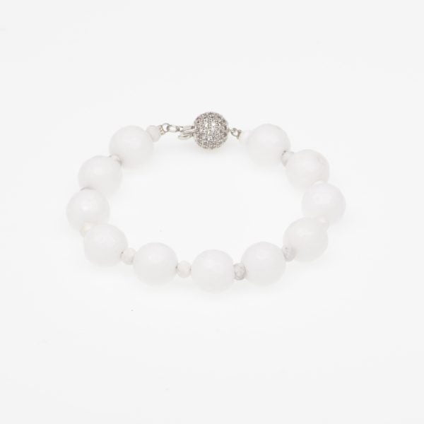 Pure Touch Bracelet- handcrafted out of faceted 10mm white jade, and 3mm faceted howlite. This bracelet sports a delicate, spherical, zirconium-encrusted locking mechanism. Idea for both special moment and day-to-day wear.